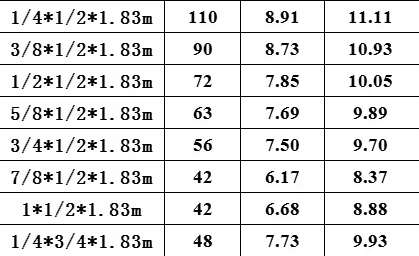 1/4*1/2*1.83m, 3/8*1/2*1.83m, 1/2*1/2*1.83m, 5/8*1/2*1.83m, 3/4*1/2*1.83m, 7/8*1/2*1.83m, 1*1/2*1.83m, 1/4*3/4*1.83m